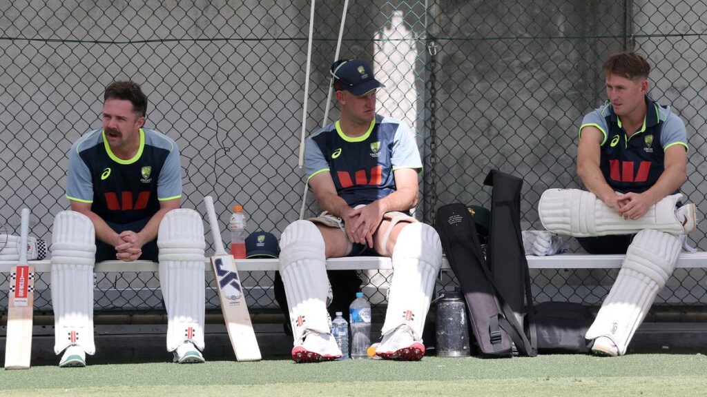 Australia’s Travis Head (L), Beau Webster (C) and Marnus Labuschagne wait to bat during a practice session at The Gabba in Brisbane on December 3, 2025