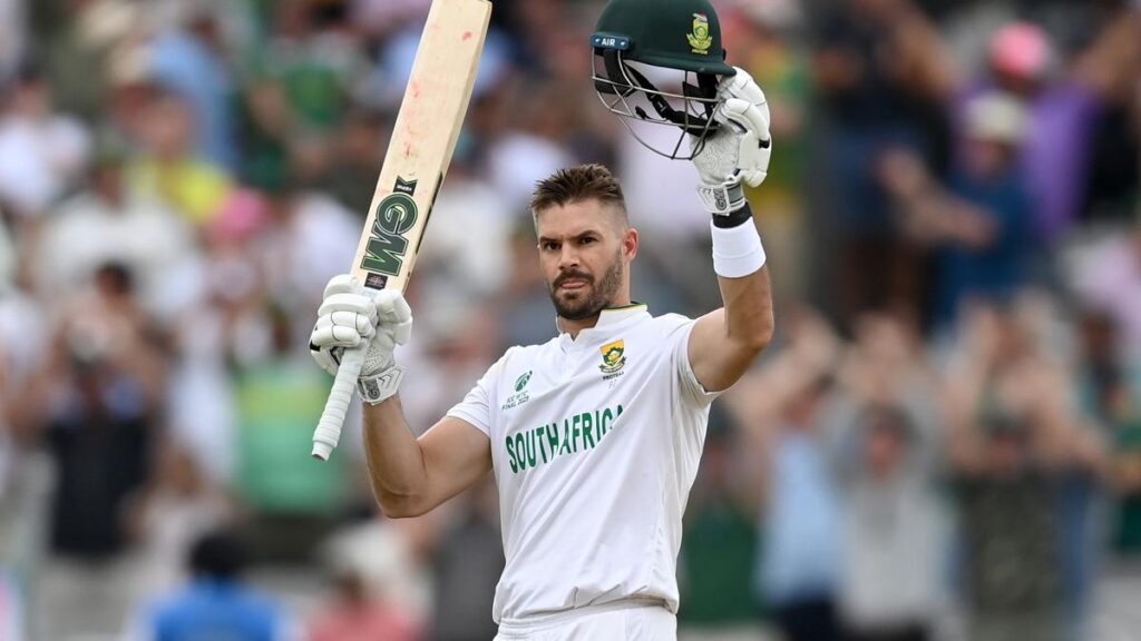 South Africa’s Aiden Markram celebrates after reaching his century during day three of ICC World Test Championship Final against Australia at Lord’s Cricket Ground on June 13, 2025 in London, England.